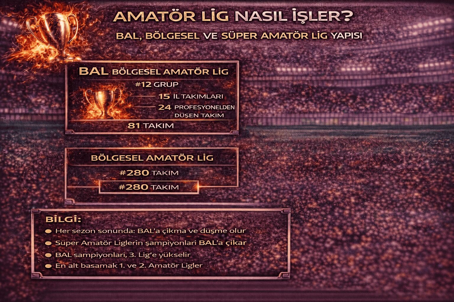 Türkiye’de amatör lig yapısı çok katmanlıdır. En üstte Bölgesel Amatör Lig (BAL) bulunur ve profesyonel liglere geçiş kapısıdır. BAL’ın altında her ilin Süper Amatör Ligi yer alır. Onun altında 1. ve 2. Amatör Ligler bulunur. Yükselme ve düşme sistemi il ve bölge bazlı düzenlenir. Amatör ligler profesyonel statüde değildir ancak resmi lisans ve federasyon denetimine tabidir. BAL şampiyonları 3. Lig’e yükselerek profesyonel seviyeye geçebilir.