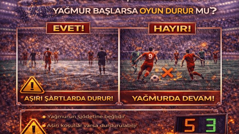 Hakem maçı hemen tatil eder mi? Hafif yağmurda oyun devam eder mi? Saha su toplarsa ne olur? Yıldırım riski varsa karar…