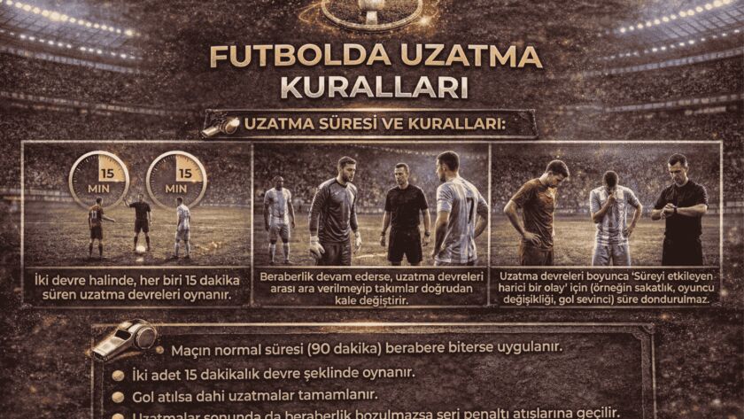 📌 Öne Çıkan Özet: Futbolda uzatma kuralları iki farklı kavramı kapsar: her devre sonunda eklenen uzatma süresi (ilave dakikalar) ve eleme maçlarında 90 dakika sonrası oynanan uzatma devreleri (2×15 dakika). 2026 itibarıyla altın gol kuralı yoktur, deplasman golü kuralı kaldırılmıştır ve kaleciler topu en…