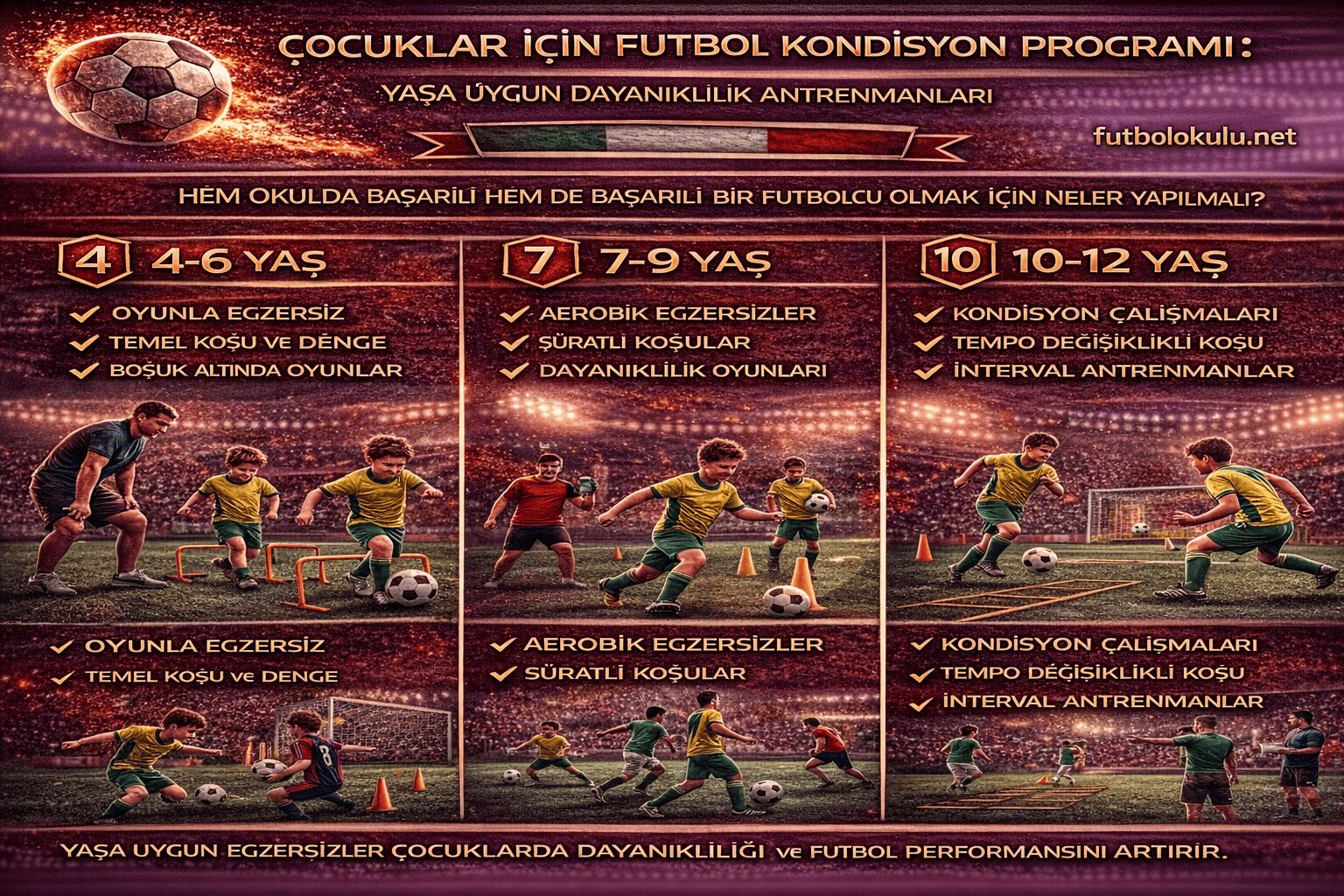 Çocuk futbolcular için kondisyon programları yaşa uygun şekilde planlanmalıdır. 6–10 yaş arası çocuklarda koordinasyon ve çeviklik çalışmaları ön planda olmalıdır. 10–14 yaş grubunda ise dayanıklılık ve hız antrenmanları daha fazla yer alabilir. Oyun temelli egzersizler çocukların hem gelişmesini hem de spordan keyif almasını sağlar. Isınma, soğuma, doğru beslenme ve yeterli dinlenme kondisyon gelişiminde önemli rol oynar.