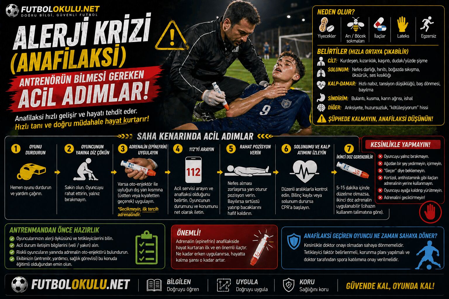Futbolda anafilaksi şüphesinde antrenörün bilmesi gereken acil adımlar çok nettir: oyuncuyu oyundan al, anafilaksiyi tanı, varsa kişisel adrenalin oto-enjektörünü gecikmeden uygula, 112’yi ara, oyuncuyu uygun pozisyonda tut, yürütme ve belirtiler düzelmezse ikinci dozu düşün. Oyuncu toparlasa bile hastane değerlendirmesi şarttır. Bu durumda en tehlikeli şey yanlış bir şey yapmak değil, geç kalmaktır.