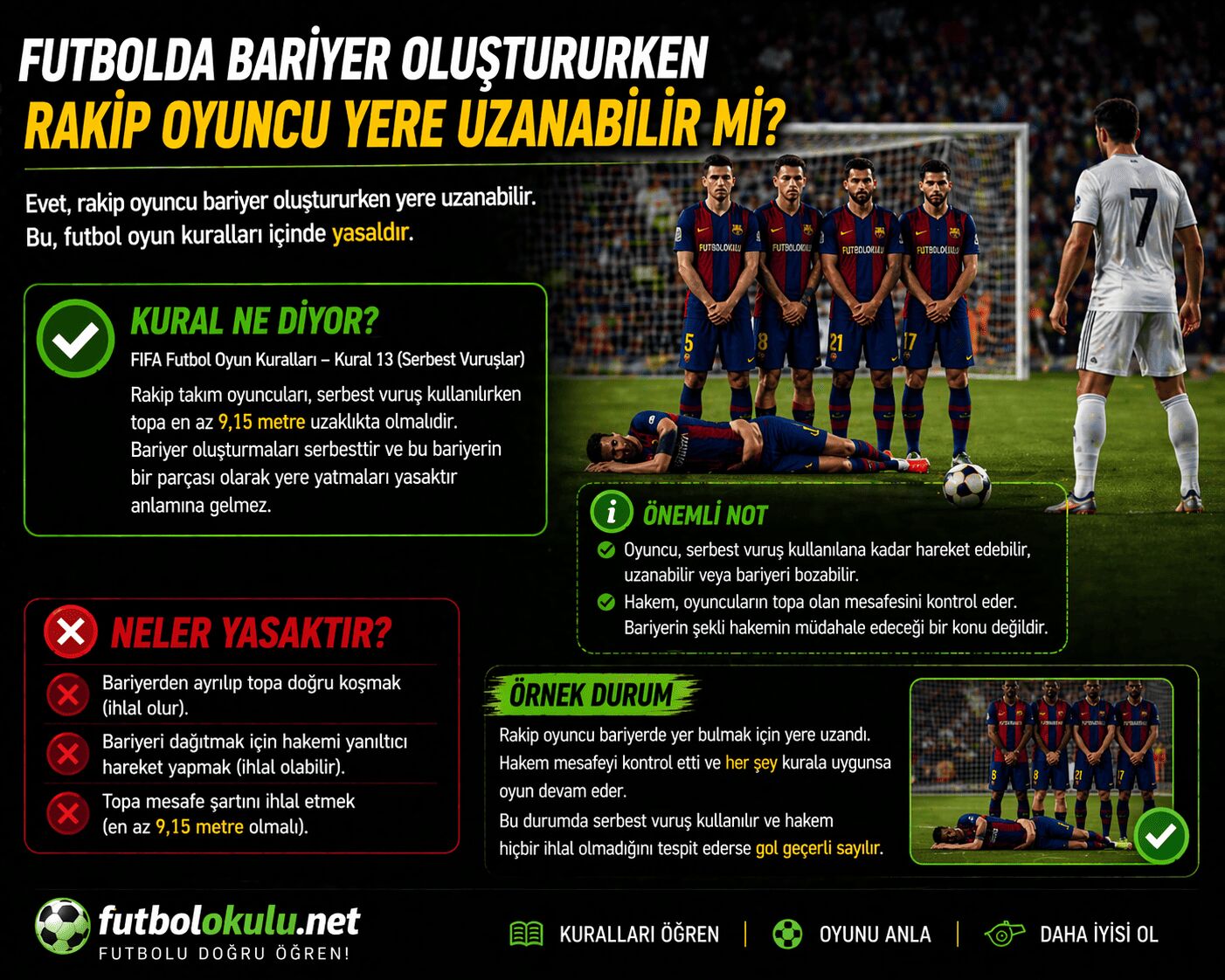 Yani halk arasında bazen düşünüldüğü gibi “bariyerde yatmak yasaktır” diye bir genel futbol kuralı yoktur. Tam tersine, bu artık modern futbolda tamamen kabul edilmiş taktik bir savunma yöntemi haline gelmiştir. Oyuncu, özellikle sıçrayan bariyerin altından geçecek vuruşları engellemek için yere uzanabilir. Hakem bunu tek başına ihlal olarak değerlendirmez. Kuralın baktığı şey, oyuncunun yerde olması değil; bu hareket sırasında başka bir ihlal yapıp yapmadığıdır.