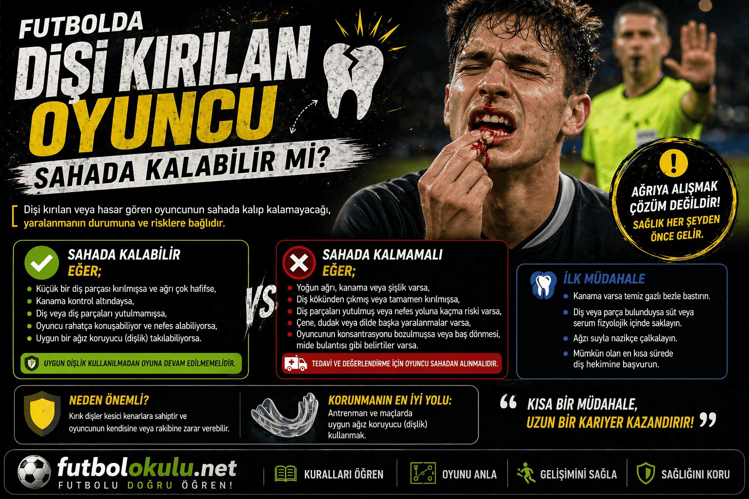 En pratik futbol cevabı şudur: Diş kırığı küçükse, kanama durmuşsa, oyuncuda baş-boyun travması belirtisi yoksa ve sağlık ekibi güvenli görüyorsa sahada kalabilir ya da kısa değerlendirme sonrası dönebilir. Ama aktif kanama, ciddi ağrı, yerinden çıkmış diş, çene travması, komosyon şüphesi veya güvenlik riski varsa sahada kalmamalıdır. Bu yaklaşım hem IFAB’ın ciddi yaralanma ve saha dışı tedavi mantığıyla hem de temel dental ilk yardımla uyumludur.