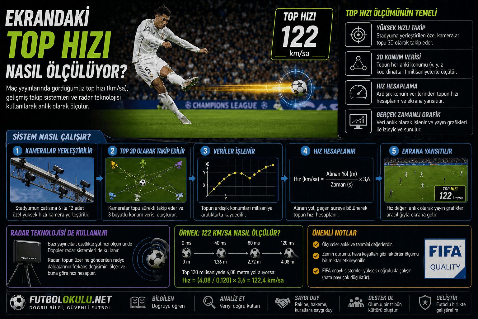Futbolda ekranda görülen top hızı, genellikle stadyumdaki optik takip kameraları ve canlı veri işleme sistemleriyle ölçülür. Sistem topun konumunu çok kısa zaman aralıklarında takip eder, bu veriden hız hesaplar ve yayıncı bunu “shot velocity” gibi bir grafikle ekrana taşır. Bazı büyük turnuvalarda top sensörü de temas anını daha hassas belirlemeye yardımcı olabilir. Her lig ve yayın aynı teknik yolu kullanmasa da, modern üst düzey futbol yayınlarında ana omurga artık kamera tabanlı canlı izleme ve veri hesaplamasıdır. Premier League’in Data Zone yayınları ve FIFA’nın EPTS/top takip standartları bunu açık biçimde destekliyor.