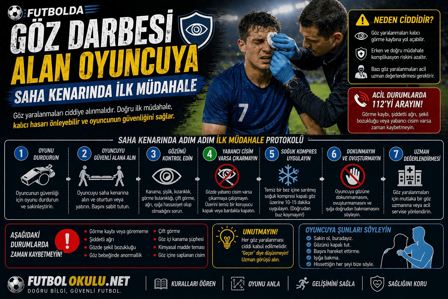 Futbolda göz darbesi alan oyuncuya saha kenarında ilk müdahale, “açılır birazdan” diye bekleyerek değil, görmeyi tehdit edebilecek travma gibi düşünülerek yapılmalıdır. Göz yaralanmaları hafif kapak ezilmesinden kornea çizilmesine, göz içine yabancı cisimden ciddi künt travmaya kadar değişebilir. NHS, görmede değişiklik, şiddetli ağrı, ışığa hassasiyet, gözü açamama, gözden kan gelmesi veya göze yüksek hızla darbe alma durumlarında acil değerlendirme gerektiğini açıkça belirtir. Amerikan Oftalmoloji Akademisi de spor göz yaralanmalarında gözü ovalamama, göze bastırmama ve özellikle göze saplanan cismi çıkarmaya çalışmama uyarısı yapar.