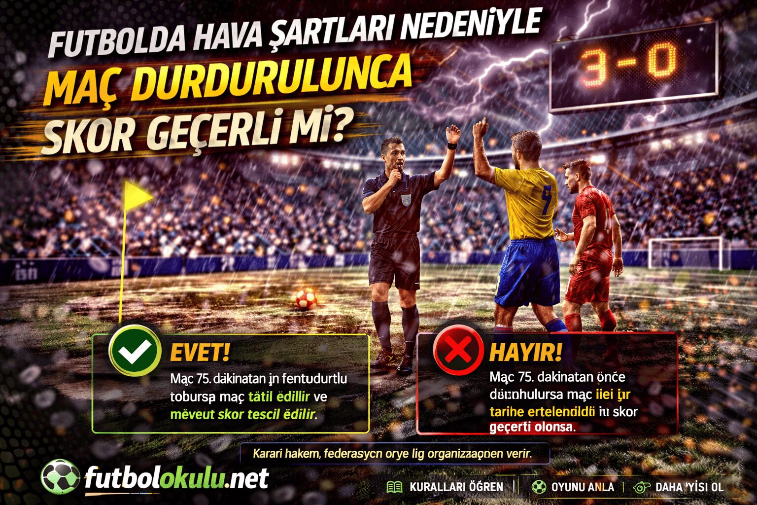 Futbolda hava şartları nedeniyle maç durdurulunca skorun geçerli olup olmadığı, maçın yalnız ara verilmiş olmasıyla tamamen tatil edilmesi arasında değişir. Eğer maç geçici olarak durdurulduysa skor aynen korunur ve oyun kaldığı yerden devam eder. Ama maç tamamen tatil edildiyse, o anki skorun otomatik olarak kesin sonuç sayılacağına dair evrensel bir kural yoktur. IFAB’ın genel yaklaşımına göre böyle bir maç normalde tekrar oynanır; fakat lig ya da turnuva talimatı farklı bir çözüm öngörebilir. Bu nedenle doğru soru yalnız “skor geçerli mi?” değil, “maç sadece durdu mu, yoksa resmen tatil mi edildi ve bu organizasyonun talimatı ne diyor?” sorusudur.