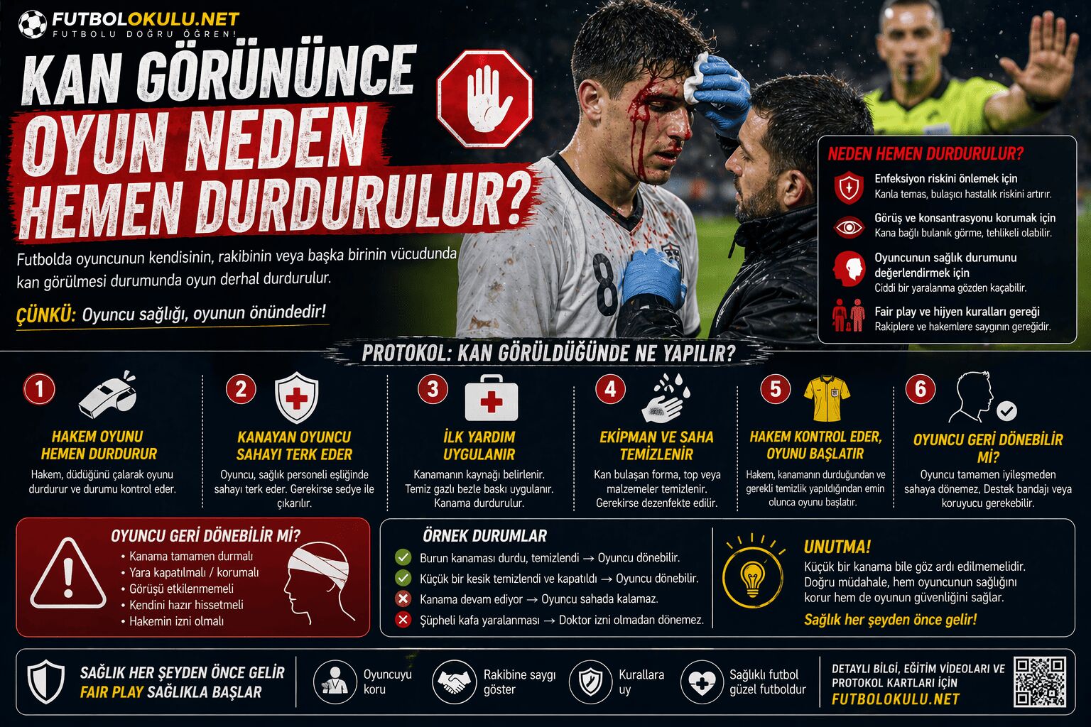 Bu da bize şunu gösterir: Kanama görmek oyunu otomatik penaltı, serbest vuruş ya da kart sürecine çevirmez. Önce sağlık protokolü işler, sonra oyun uygun restartla sürer.