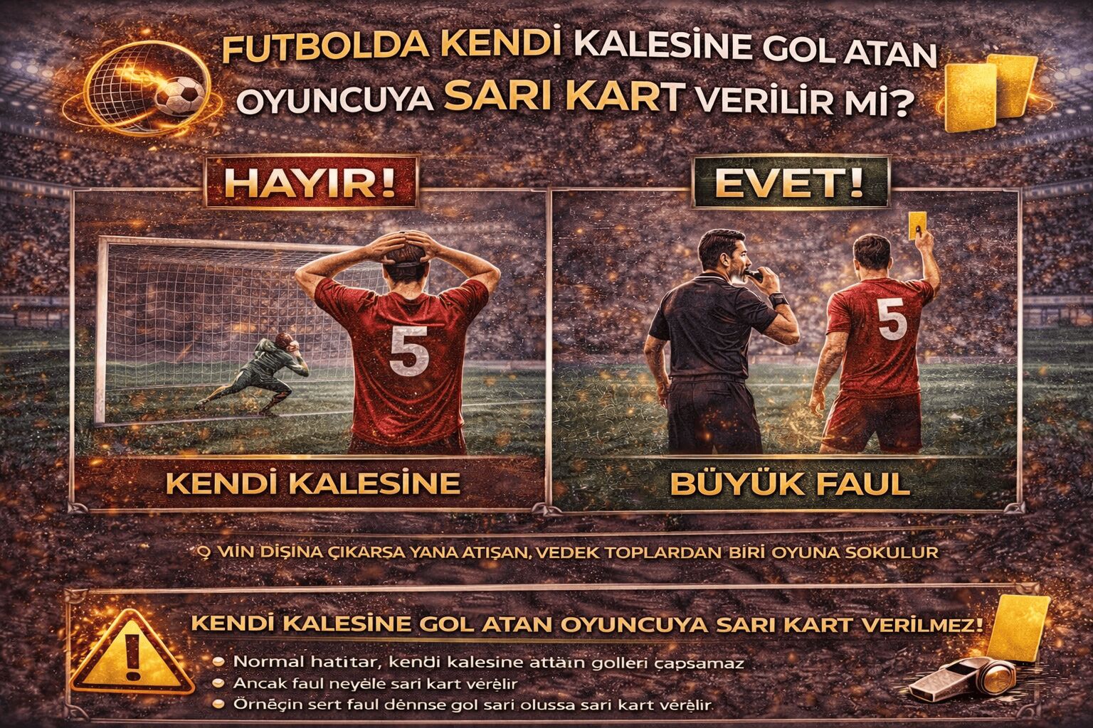 Futbolda kendi kalesine gol atan oyuncuya otomatik olarak sarı kart verilmez. Own goal bir kural ihlali değil, oyun içi hatadır. 2026 itibarıyla IFAB kuralları çerçevesinde own goal disiplin cezası gerektirmez. Ancak bilerek atıldığı açıkça tespit edilirse sportmenlik dışı davranış kapsamında sarı kart veya disiplin soruşturması gündeme gelebilir. Normal şartlarda kendi kalesine gol tamamen talihsiz bir oyun hatasıdır ve kart uygulanmaz.