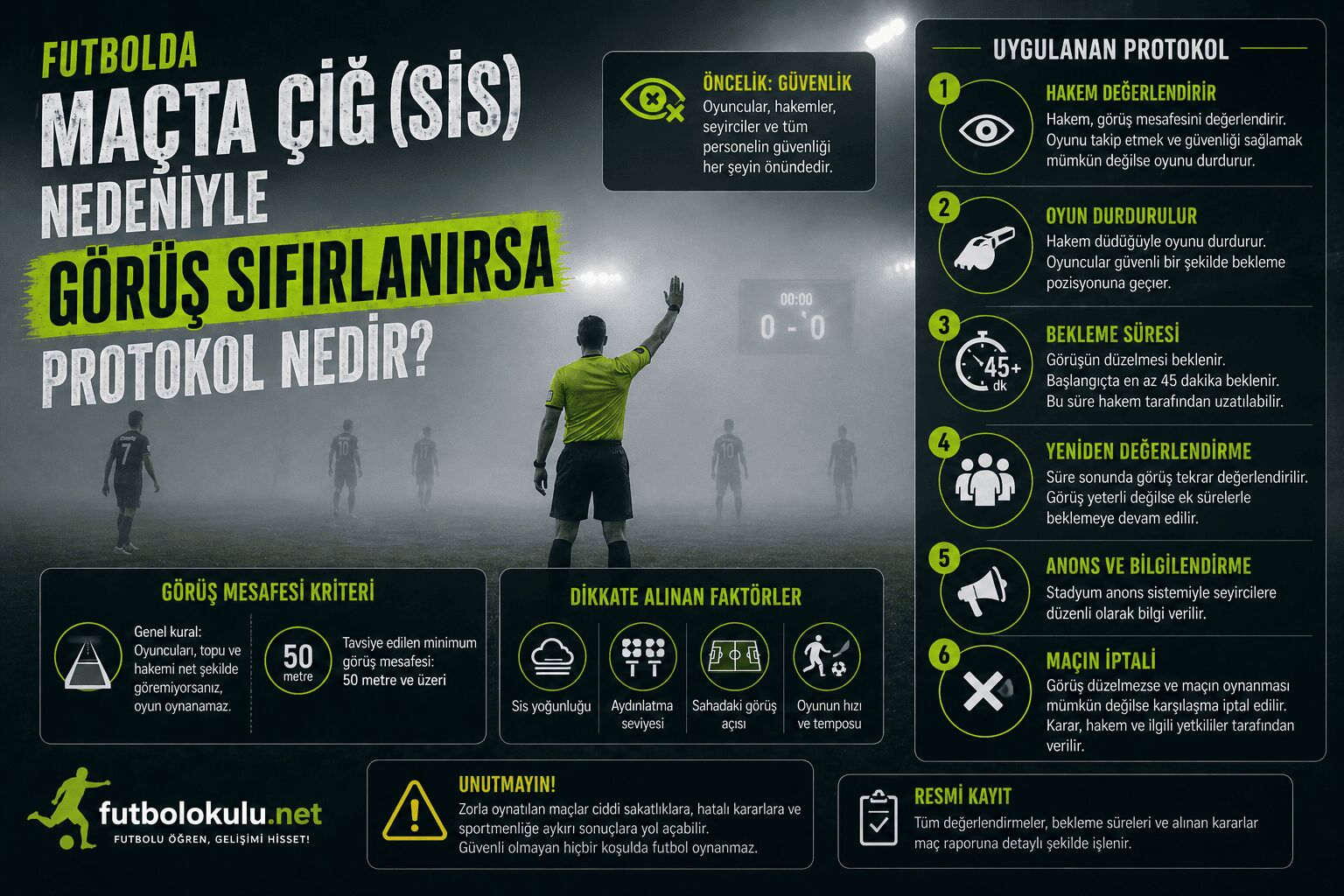 Futbolda maç sırasında sis nedeniyle görüş sıfırlanırsa protokolün temeli çok nettir: Önce oyun güvenliği, sonra maçın devamı düşünülür. Hakem oyunu durdurur, yardımcı hakemler ve organizasyonla görüşür, oyuncuları güvenli şekilde bekletir veya soyunma odasına gönderir. Görüş düzelirse maç kaldığı yerden devam eder. Görüş düzelmezse müsabaka tatil edilebilir ve resmi süreç ilgili talimatlara göre yürür.