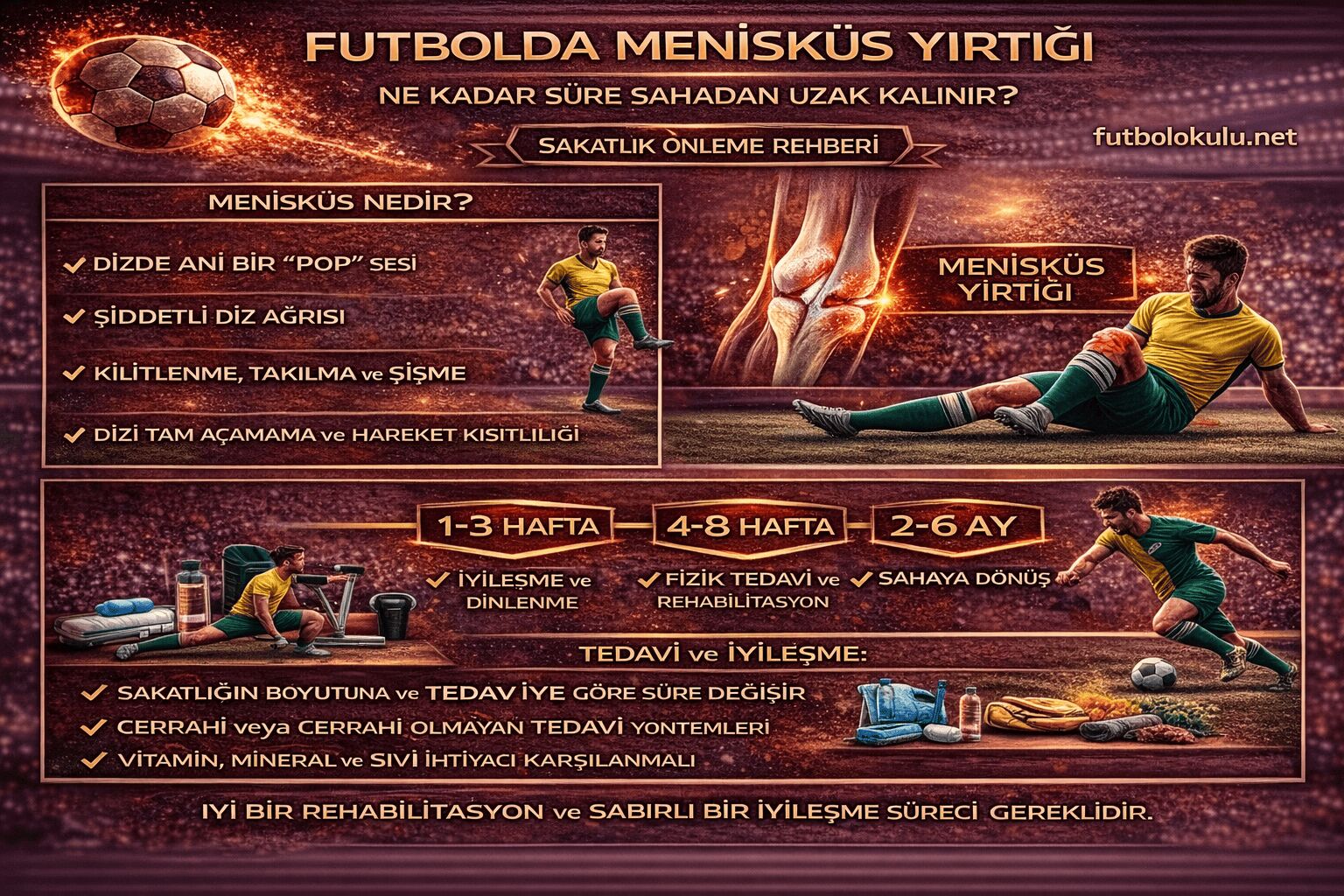Bu kapsamlı rehberde menisküs yırtığının futbolcularda nasıl meydana geldiğini, belirtilerini, tedavi yöntemlerini ve sahaya dönüş süresini detaylı şekilde ele alıyoruz.