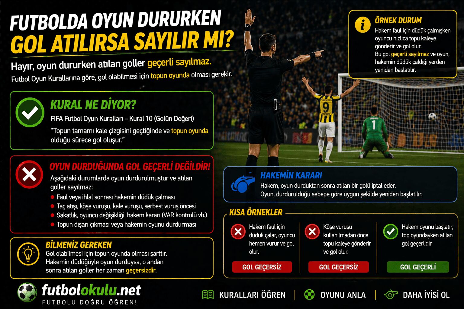 Bunların ortak noktası aynıdır: Top ağlara giderken oyun hukuken canlı değildir. Futbolda gol, ancak canlı oyun içinde doğar. Oyun yoksa gol de yoktur.