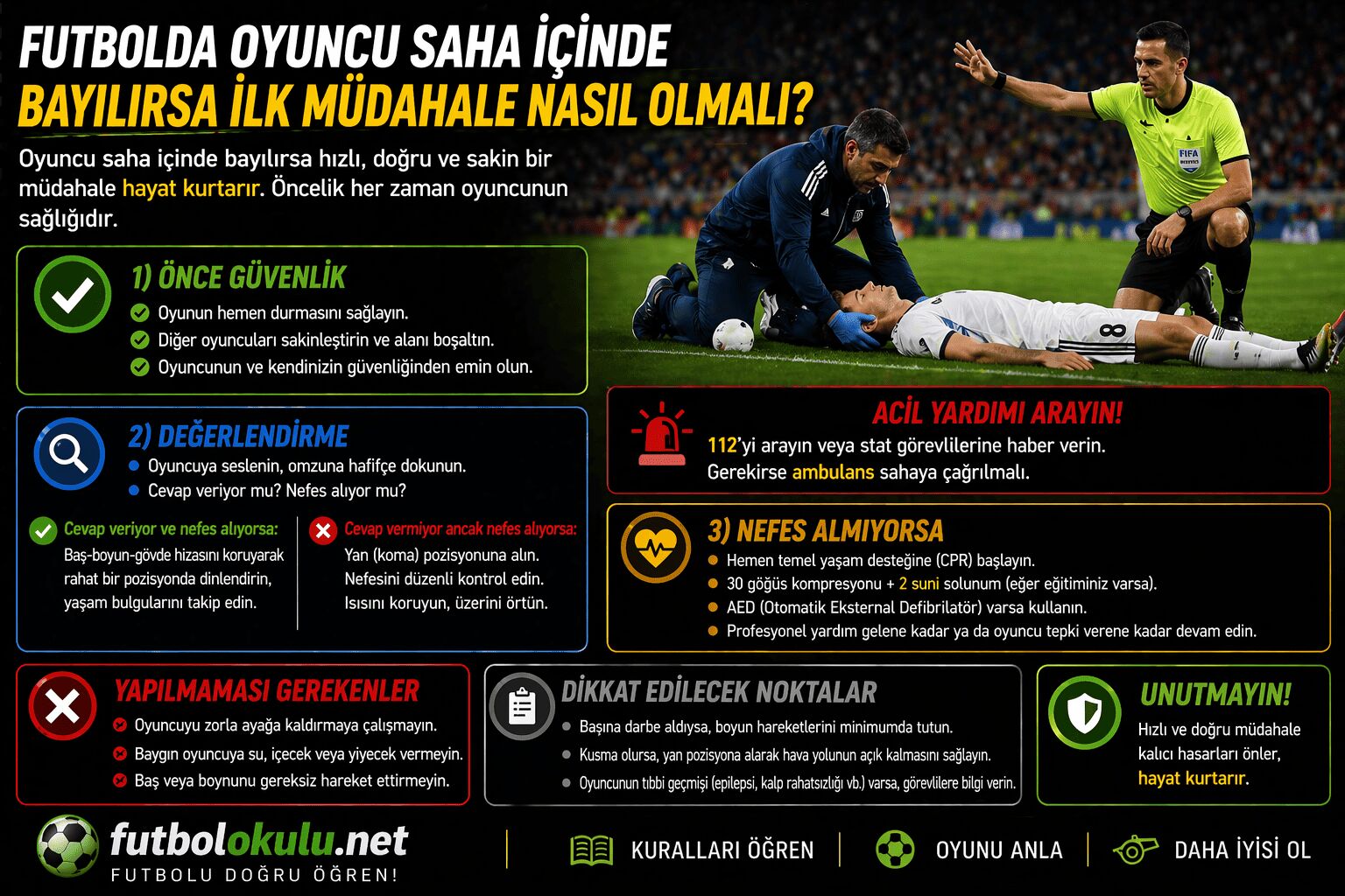 Futbolda oyuncu saha içinde bayılırsa ilk müdahale, olayı sıradan bir fenalaşma gibi değil acil tıbbi durum gibi ele almaktır. Oyun hemen durdurulmalı, sağlık ekibi çağrılmalı ve oyuncunun bilinç ile normal solunumu hızla değerlendirilmelidir. Oyuncu yanıtsız ve normal nefes almıyorsa CPR ile AED gecikmeden devreye girmelidir. Oyuncu bilinçsiz ama nefes alıyorsa hava yolu korunmalı, gereksiz hareket ettirilmeden izlenmeli ve profesyonel ekip yönetimi beklenmelidir. Kafa travması ya da sarsıntı şüphesinde oyuncu sahadan çıkarılmalı ve oyuna dönüş kararı aceleye getirilmemelidir. FIFA, UEFA, AHA, NHS ve British Red Cross kaynakları bu temel acil yaklaşımda büyük ölçüde aynı çizgide buluşur.