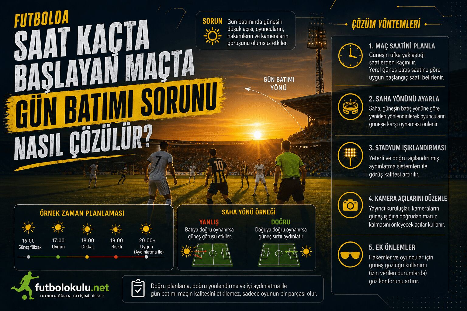 Kısa cevap şudur: Gün batımı sorunu, maç başlamadan önce doğru saat planlaması ve uygun saha aydınlatmasıyla çözülür. Maç başladıktan sonra karanlık oyunu ve oyuncu güvenliğini etkiliyorsa hakem müdahale eder.