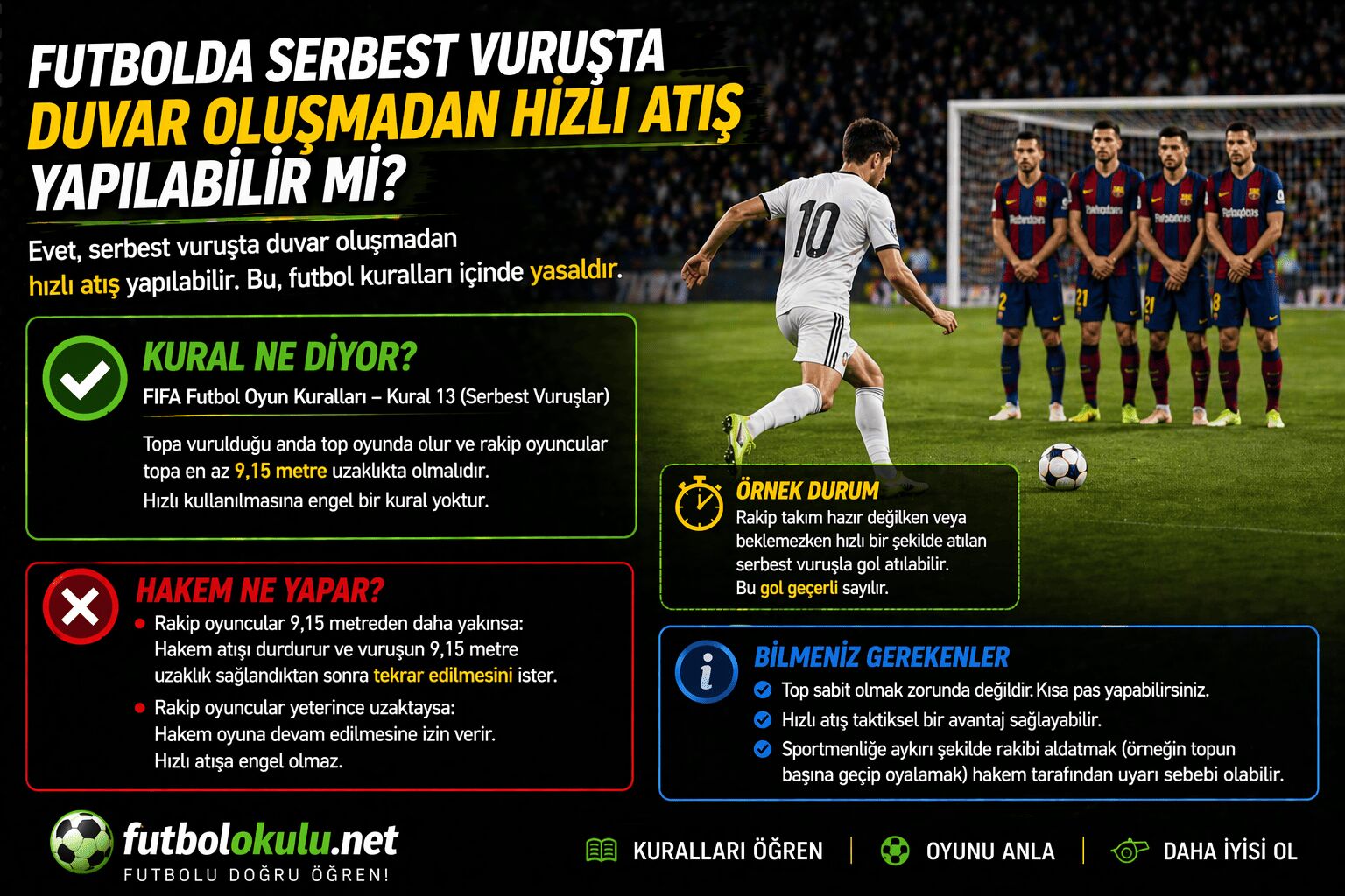 Buradaki mantık çok nettir: Hızlı kullanmak istiyorsan, savunmanın tam çekilmemiş olmasının yaratacağı riski de üstlenirsin. Ama rakip oyuncu özellikle topun önünde kasten dikiliyor, mesafe almayı reddediyor ya da vuruşu bilinçli şekilde bloke ediyorsa, o zaman hakem disiplin uygulayabilir. Yani kurallar savunmayı korumaz ama oyun geciktirmeyi de ödüllendirmez.