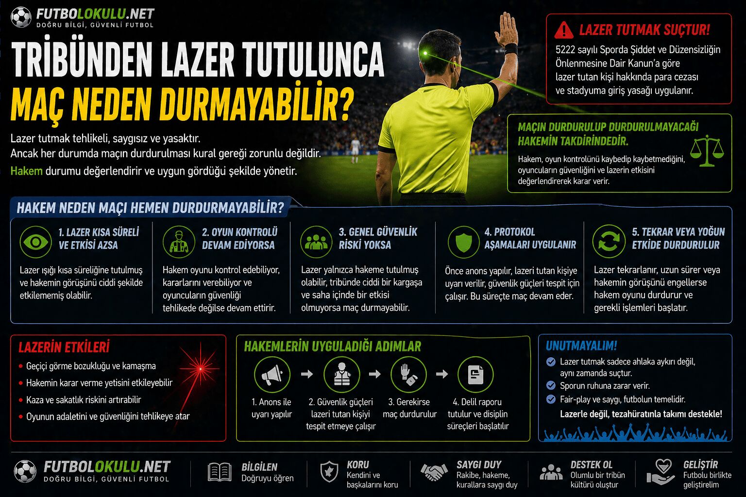Kısa ve net cevap şu: Tribünden lazer tutulması, tek başına “maç kesin durur” kuralı doğurmaz. Hakem, lazerin oyuncuyu gerçekten etkileyip etkilemediğine, güvenlik riski yaratıp yaratmadığına ve oyunun düzenini bozup bozmadığına bakar. Eğer lazer kısa süreliyse, oyunu belirgin biçimde etkilemiyorsa ya da hakem oyunun akışını bozacak kadar ağır görmüyorsa maç devam edebilir. Ama lazer, özellikle kaleciye, penaltıcıya veya topa aktif oyuncuya yönelip oyunu etkiliyorsa hakem oyunu durdurabilir.