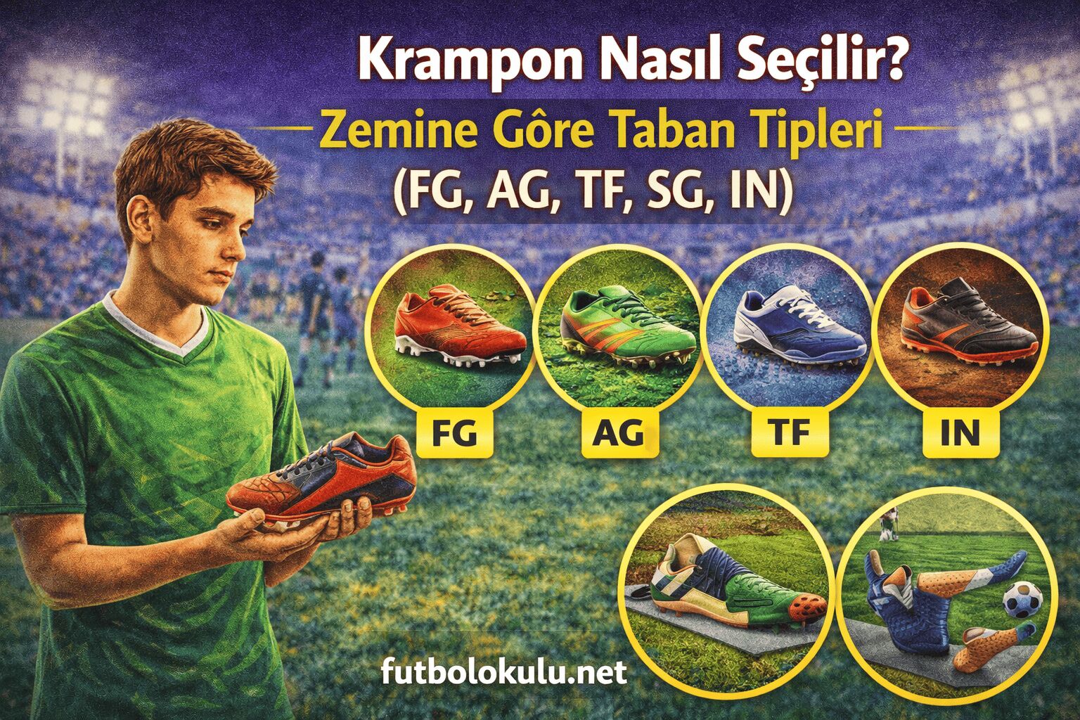 Bu rehberde FG, AG, TF, SG ve IN krampon tiplerinin farkları, hangi zeminde hangisinin kullanılması gerektiği ve doğru krampon seçimi detaylı şekilde anlatılmaktadır.