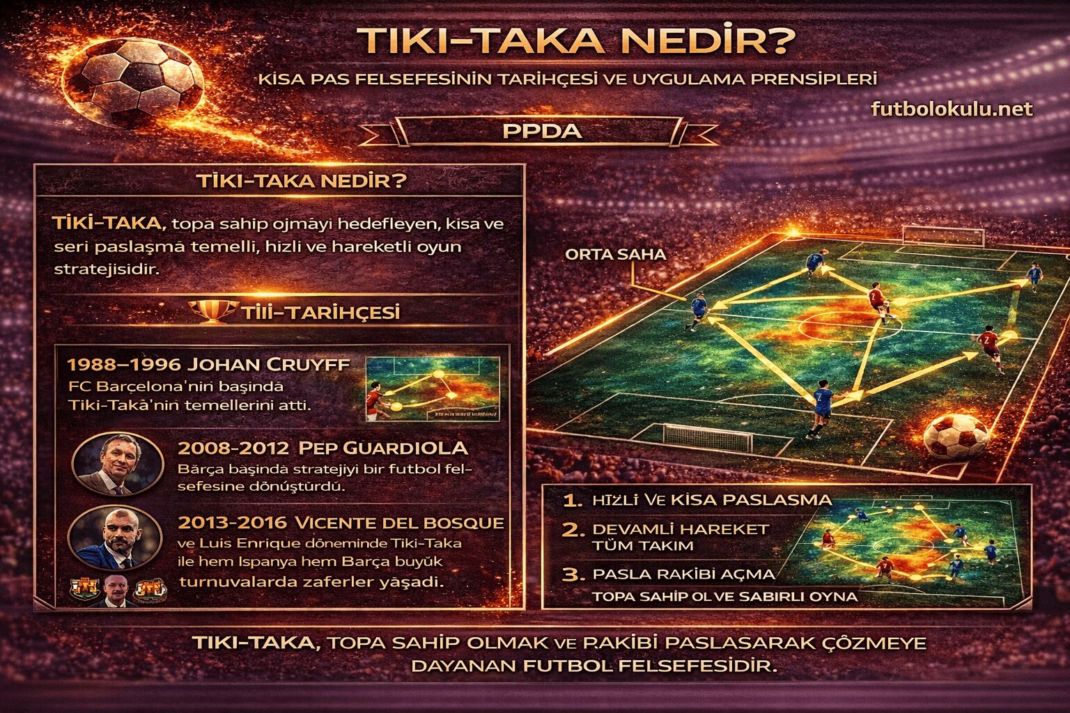 Bu kapsamlı rehberde Tiki-Taka futbolunun kökenlerini, taktik yapısını, tarihsel gelişimini ve sahadaki uygulama prensiplerini detaylı şekilde ele alıyoruz.